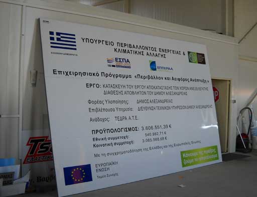 Μεταλική επιγραφή αναγγελίας έργου ΕΣΠΑ διάστασης 4.00m x 3.00m.Τα μεταλλικά φύλλα στηρίζονται σε μεταλλικό πλαίσιο 3ετή εγγύηση των γραφικών σε εξωτερικό χώρο.